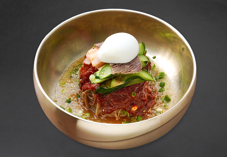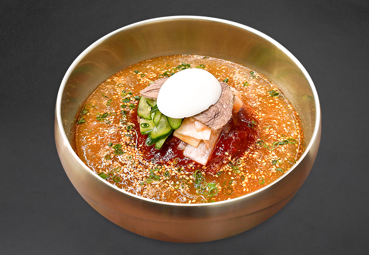 甘辛タレの麺に甘酸っぱく清涼感のある冷たいスープを入れた冷麺